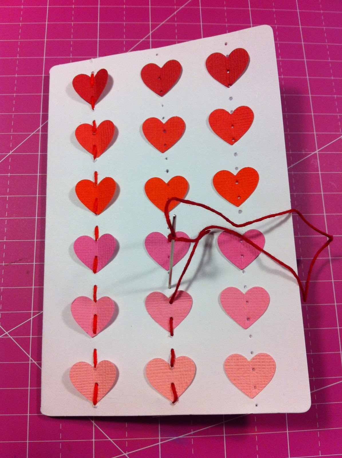 Here we go, I used the straight sewing tool and punctures holes threw the hearts and the card. I had to go threw a couple spots with the needle tool because I had some trouble going threw the hearts.